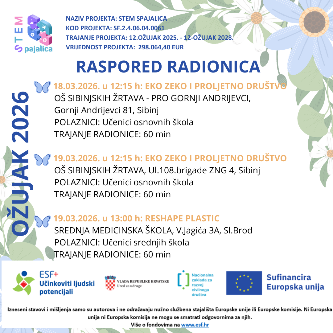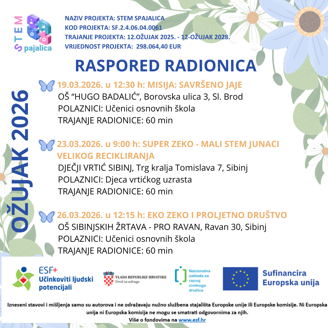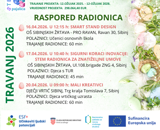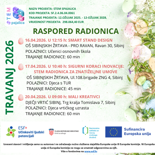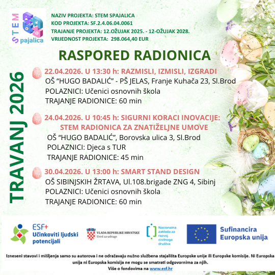 Ovim putem Vas obavještavamo da će se radionica za djecu s teškoćama u razvoju "Sigurni koraci inovacije: STEM radionica za znatiželjne umove " u OŠ Sibinjskih žrtava, predviđena za 17.04.2026. u 10:40 h, održati 17.04.2026. [...]